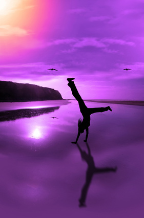 a happy young woman celebrating on an isolated irish beach in motion